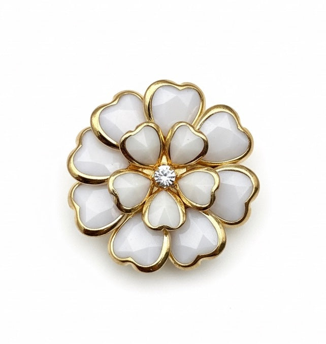 A soft glow, a crisp shirt, and the quiet clink of porcelain cups in a Parisian café — this button cover captures that exact mood. Delicate white petals edged in gold embrace a single crystal at the center, radiating understated elegance.