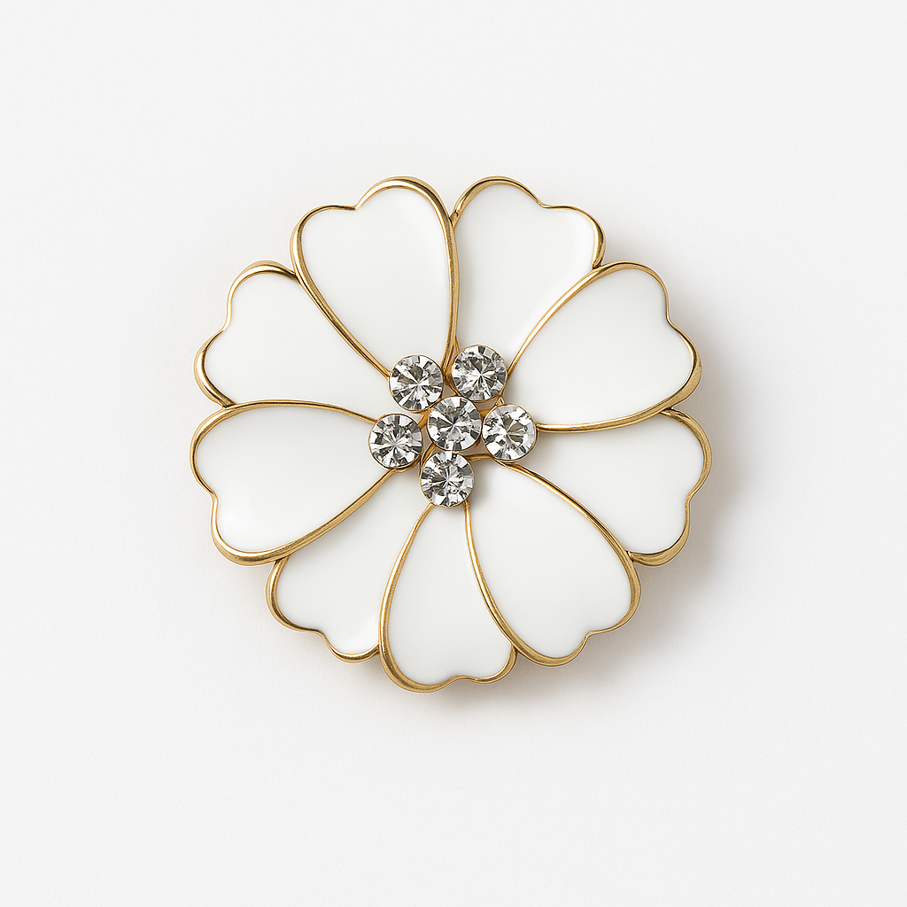 Delightfully dreamy. These floral button jewels feature smooth white enamel petals edged with subtle golden tone trim, encircling a sparkling crystal center. Its airy elegance brings a touch of playful sophistication, perfect for elevating both casual and dressy looks.